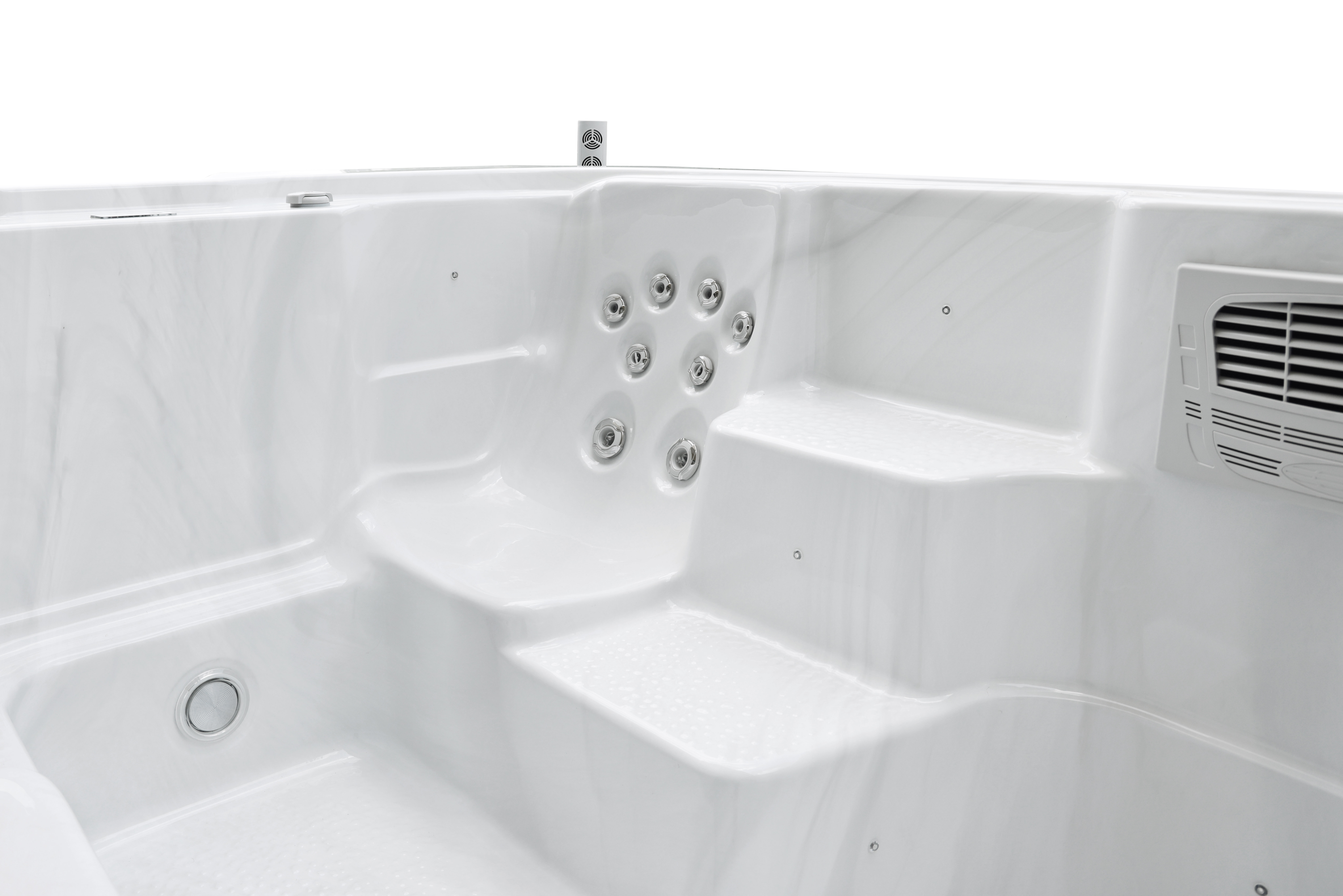 Усиленное дно из стекловолокна и защитная крышка для спа обеспечивают долговечность конструкции, поддержание температуры воды и безопасность эксплуатации.
